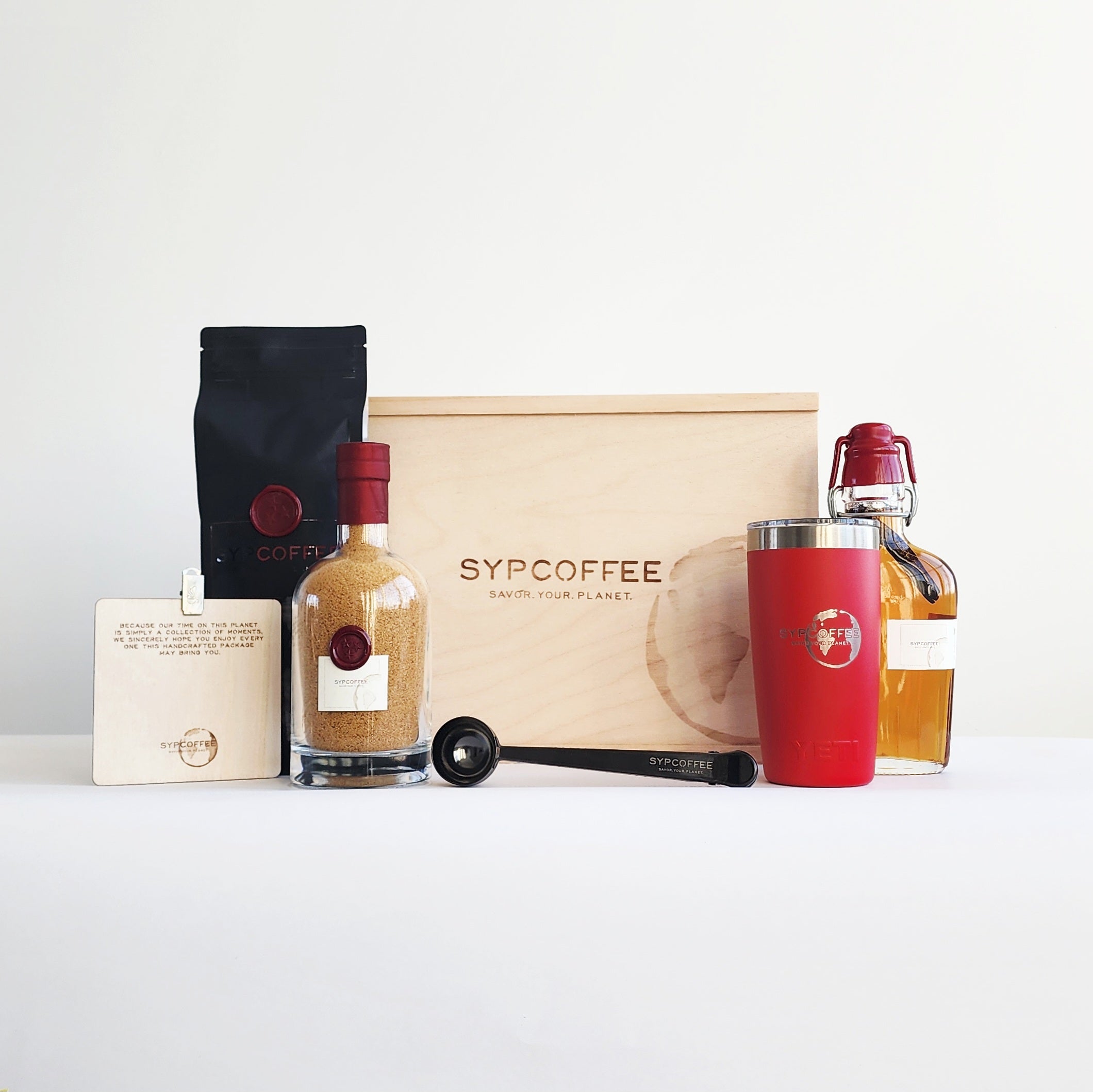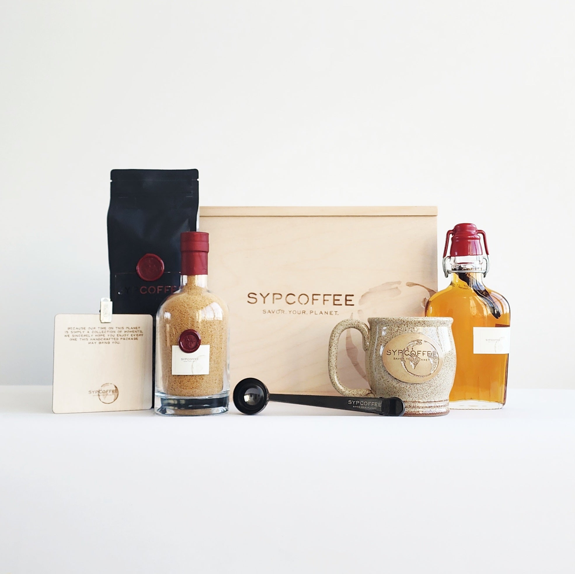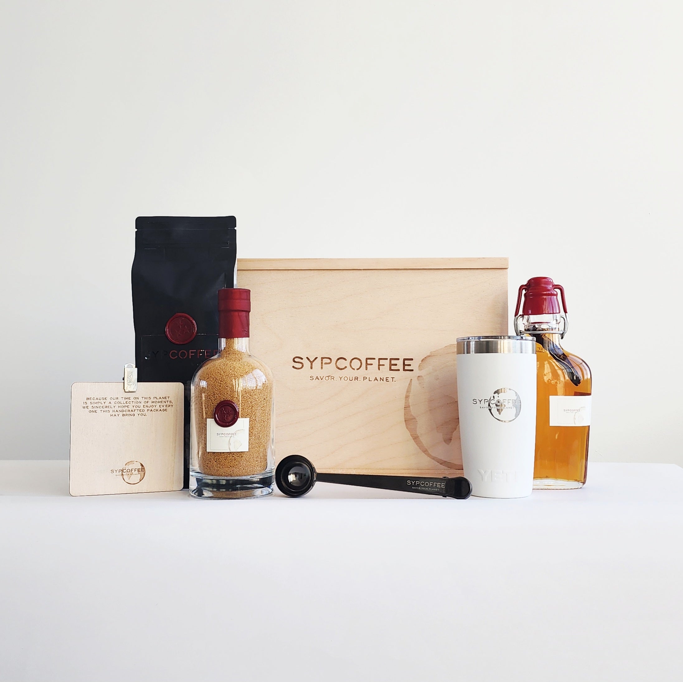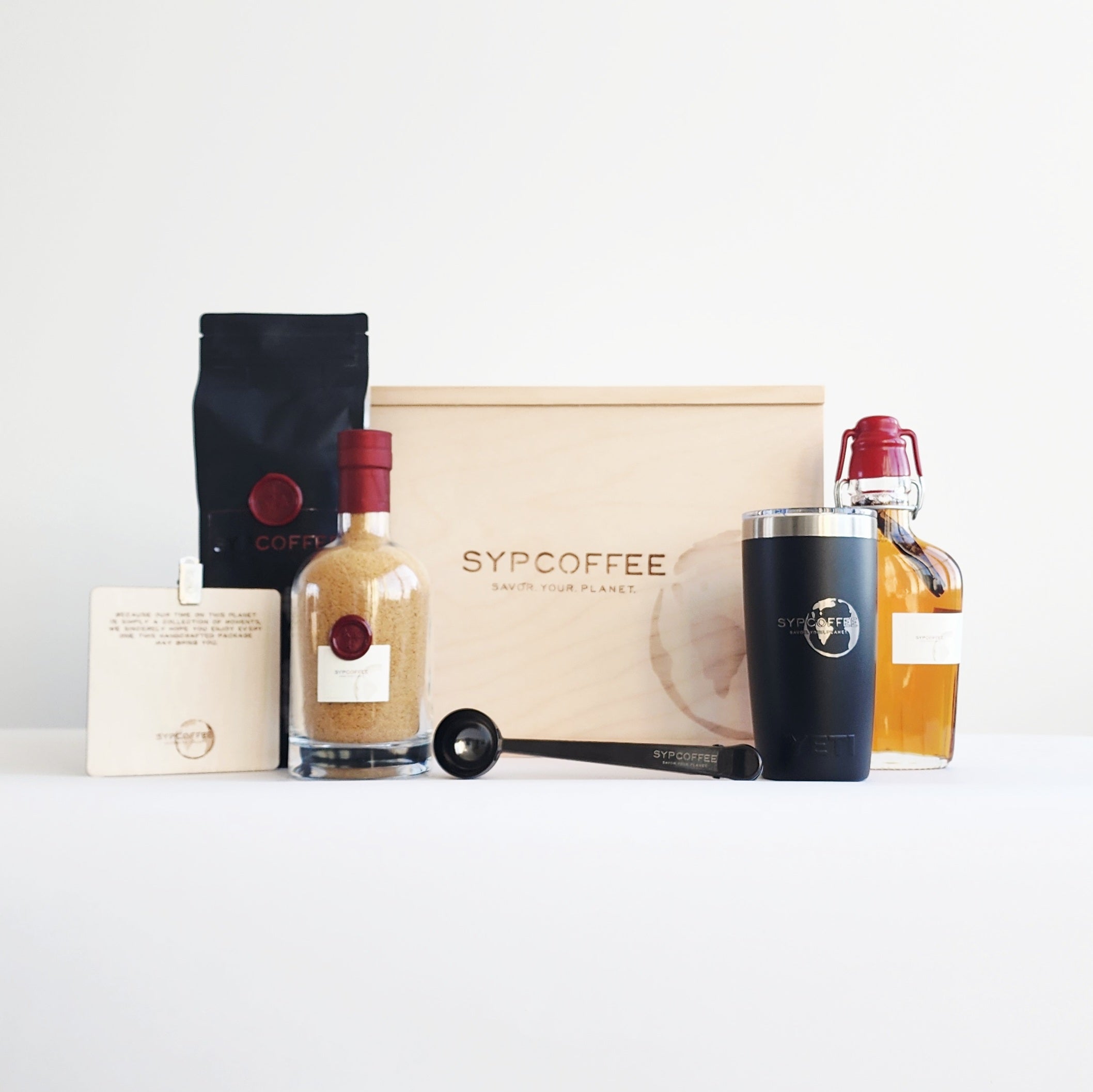 After roasting your SYPCOFFEE as soon as you order, we carefully place alongside all of the ingredients worthy of your beautiful thought. This includes our signature, SYPMug OR SYPYETI, SYPCOFFEE Sugar and SYPCOFFEE Maple Syrup. We add a SYPCOFFEE Scoop and Bag Clip, before engraving your personal message onto a keepsake wood card.
